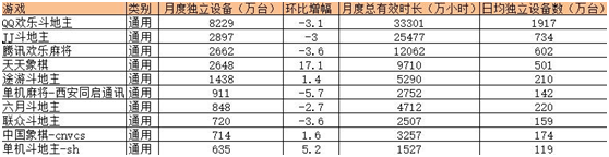 艾瑞数据显示,4月共有219款棋牌游(yóu)戏的月度独立设备(bèi)数超过10万台,而3月份的数据为221款(kuǎn),总体变化并不明(míng)显。其中保(bǎo)持增幅状态的棋(qí)牌游戏有89款,持平4款(kuǎn),月活呈(chéng)下降趋势的共126款。