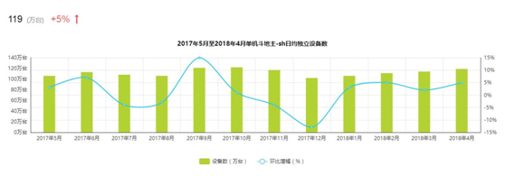 而在棋牌游戏总体表现(xiàn)不好的(de)情况下,《单机斗地主-sh》逆(nì)势而上,环比增幅达5.2%,4月的日均独立设备数达119万台。根据它的月(yuè)活和(hé)日活的数据变化(huà)来看,从2017年底这款游戏就(jiù)可以说是(shì)已经(jīng)触(chù)底反弹,表现(xiàn)抢眼。
