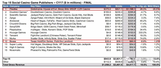 全球 Top 15 社交**类游戏发行商(shāng) 2017 年收入 | 来(lái)源:Eilers&Krejcik Gaming
