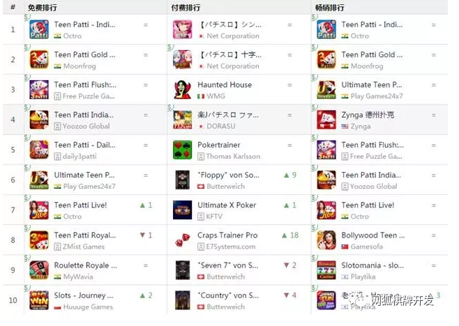 观察印度的榜(bǎng)单可以发现(xiàn),印(yìn)度人民喜(xǐ)爱**类游戏且对炸(zhà)金花情(qíng)有独钟。三(sān)款(kuǎn)炸金(jīn)花(huā)两(liǎng)年长期霸(bà)屏印度游戏(xì)畅销(xiāo)榜,至今热度不减。这种(zhǒng)趋(qū)势在娱乐场游戏细分榜单体现得(dé)更加淋漓尽致(zhì)。下载 Top 10 里前 8 名全部是炸金花游戏,在印度(dù)下了重注成立分公司的游族(zú),旗下炸金花游戏(xì)《Teen Patti India》排(pái)在第 4 位。畅销(xiāo)榜里也有7款炸金花(huā)游戏(xì)。除了炸(zhà)金(jīn)花之外(wài),目前在印(yìn)度(dù)市场比较多的(de)就是老虎机(jī)游戏。Playtika、Huuuge Games 以及中国的一些厂商(shāng)都开始在印(yìn)度推出老虎(hǔ)机游戏。