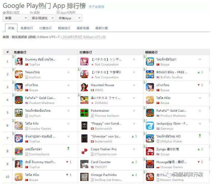 5 月 9 日 Google Play 泰(tài)国娱乐场游戏类 App 榜单|来源:App Annie