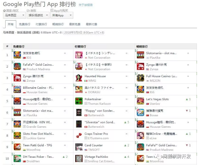 马来西亚的榜单(dān)体现了(le)更加多元化的特质,老虎机、德州扑克、甚至(zhì)印度的炸金花都出现在下载、畅销 Top 10 中(zhōng),同时(shí)也没(méi)有哪个国家的游戏(xì)厂商占(zhàn)据(jù)明显优势。