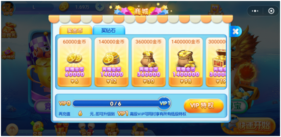 《途游捕鱼》采用金币(bì)和(hé)钻(zuàn)石双货币模式,不过与腾讯系棋牌游戏的货币体系不同(tóng)的是,《途游捕鱼(yú)》的金币(bì)和钻石(shí)并没有(yǒu)直接关联,是(shì)两种功能完全不同的货币体系。钻石用(yòng)来购(gòu)买游戏(xì)道具,如升(shēng)级炮台,购买技能卡等。金币则是用于(yú)游戏中(zhōng)的捕鱼炮弹消耗。简单来说:想变(biàn)强?充钻石。想继续玩我的游戏?充金(jīn)币。