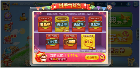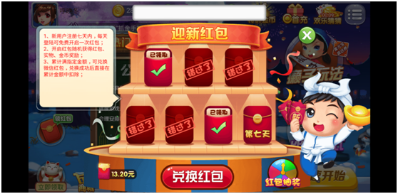 新用户注册前七天,每(měi)天签到领红(hóng)包,红(hóng)包金额随机,满30元可提现,每1元红包(bāo)可获得抽奖机会一次,奖品包括游戏(xì)道(dào)具、实物奖励、金币等。