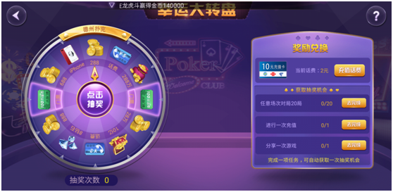 完成任务获取抽(chōu)奖(jiǎng)机会。德州扑克(kè)之夜每(měi)天会免费赠送(sòng)一次抽奖机会(huì),奖品有话(huà)费、金(jīn)币、钻(zuàn)石、实(shí)物等(děng)。免费抽取(qǔ)一次奖励后,完成20场对局、进行一次(cì)任意金额的充(chōng)值(zhí)、分享一次游戏分别可再获(huò)得一(yī)次(cì)抽奖机(jī)会。