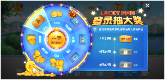 固定日(rì)期(qī)登陆获取抽奖(jiǎng)次数。新玩家注册后,前(qián)两天各自拥有一次抽奖(jiǎng)机会(huì),后(hòu)续(xù)每隔(gé)3天(tiān)获(huò)取(qǔ)一次抽奖机(jī)会。奖品包(bāo)括:金(jīn)币、兑换券(quàn)、话费。