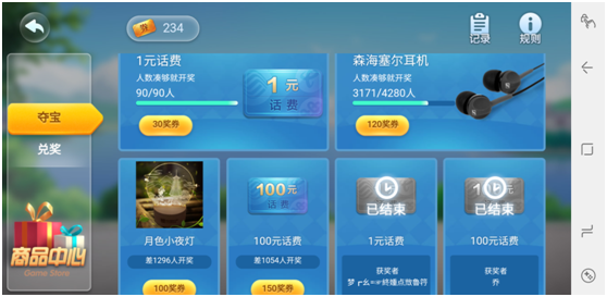根据游戏赢的局数来抽取话(huà)费券(quàn):在(zài)游(yóu)戏对局过(guò)程(chéng)中,分别在赢(yíng)到3/8/15局数时获得一次抽(chōu)奖机会,奖品内容有:话费券、金币,其中话费券(quàn)的奖项只有一个(gè),金币奖项两个。