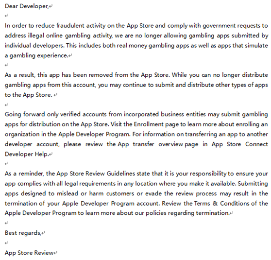 Store的欺诈行为,并(bìng)遵守政府要(yào)求解决非法在(zài)线(xiàn)赌博活动(dòng)的要(yào)求(qiú),我(wǒ)们不再(zài)允许(xǔ)单个开发商提交赌博应用程序。这包括真(zhēn)实货币赌博应用程序以及(jí)模拟赌博体验(yàn)的应用程序。因此,这个应(yīng)用(yòng)程序(xù)从(cóng)App Store下架。当你不能再从(cóng)这个(gè)账户分发游(yóu)戏应(yīng)用程序时,你可以继(jì)续向App