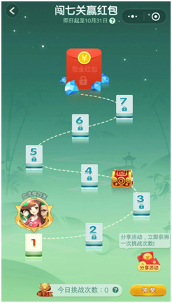 此外,游(yóu)戏(xì)中新(xīn)增的(de)闯(chuǎng)关红(hóng)包模块,则是对游戏玩家吸引(yǐn)力最(zuì)大的地方。闯(chuǎng)关场共设(shè)七(qī)关,每名(míng)玩家每天有两次挑(tiāo)战(zhàn)机会,在每次对局中都能获得前两名,并一直(zhí)赢到(dào)最后第(dì)一名,才有机会获得不定额(é)现金红(hóng)包。红(hóng)包首次(cì)提现(xiàn)不设限制,此后单次提现(xiàn)需满5元。玩(wán)家将活动(dòng)分享出去(qù),可额外获得一(yī)次挑战机会,从推广的角度来看,这也(yě)是非常(cháng)有(yǒu)帮助的。