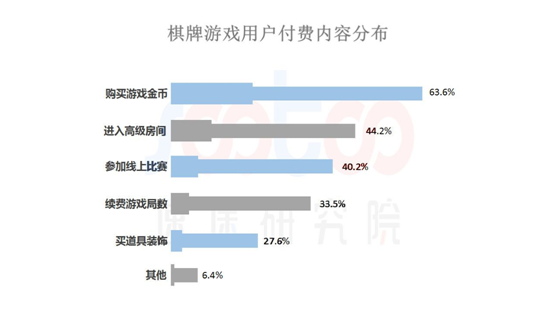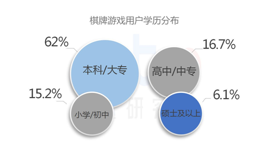 报告中,对于棋牌游戏的付费(fèi)点(diǎn)也做了调查。其(qí)中,游戏玩家的付费(fèi)比例最高(gāo)的还(hái)是游戏内的金币购买,其次才是游戏开房。而在游戏用(yòng)户学历的分布(bù)上,大专和本科学历的游戏玩家占比高达(dá)62%。这(zhè)一类玩家一般(bān)都有较(jiào)为稳定的收入,因而也是付费用(yòng)户的主要来源。