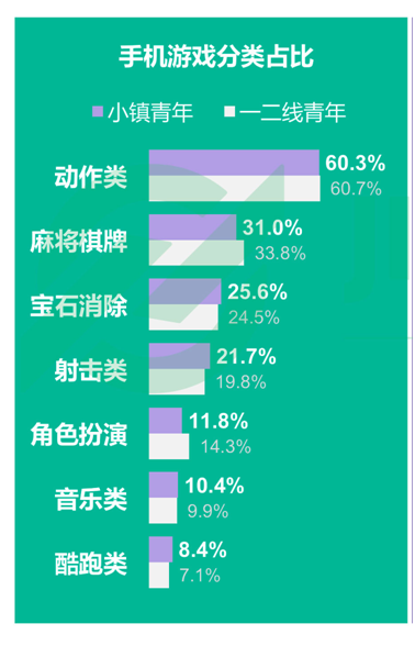此(cǐ)外,随着智能手机(jī)的普及,线上棋牌(pái)游戏几乎可(kě)以(yǐ)触及到(dào)每(měi)一个潜在的游戏用户。而(ér)根据极光大(dà)数据推出(chū)的《2018年8月小镇(zhèn)青年消费(fèi)研究报告》中指出,除了动作类(lèi)游(yóu)戏(xì)以外,不管是一二线城市青年还是小镇青年(nián),麻将棋牌游(yóu)戏在他们手机游(yóu)戏(xì)分类中的占比都是(shì)最多的。