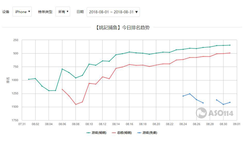 从苹果的游戏排(pái)行(háng)榜变(biàn)化趋势上(shàng),也(yě)可以发现,8月份(fèn)《姚(yáo)记捕鱼》的总排名(míng)都是(shì)呈稳(wěn)定上升的(de)趋势,在APP总榜和游戏类畅销榜上,增幅均超过500名。而从艾(ài)瑞(ruì)咨询提供(gòng)的具体的月活(huó)变化数据来看(kàn),8月《姚记捕鱼(yú)》的月(yuè)活(huó)和上(shàng)月相(xiàng)比,增加了(le)约5万台。