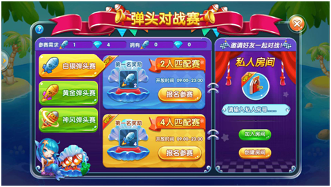在比赛模(mó)式中,玩家赢得比赛除了可以得(dé)到(dào)游戏道具奖(jiǎng)励以(yǐ)外,这里还借鉴棋牌类游戏运(yùn)营的方(fāng)法(fǎ),设置了好友对战版块,游戏用户可以邀请好友一起参与游戏,增(zēng)强了捕(bǔ)鱼游(yóu)戏(xì)的社交属(shǔ)性。