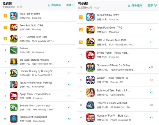 从App Store上印度地区最(zuì)新的(de)免费(fèi)榜和(hé)畅销榜榜单显示,印度本土的棋牌游戏公司Octro旗下的《Teen Patti》都是占据(jù)首位。同时,榜单排(pái)名前三的(de)游戏都是《Teen Patti》,也(yě)就是国内俗称的炸金(jīn)花玩法,只(zhī)是公司不同(tóng)而已。由此可见,这种棋牌游戏(xì)玩法在(zài)印(yìn)度本土非常流行,用户(hù)基础十分广泛,忠诚度高。而凭借这(zhè)款游戏的优异表现,Octro的每年(nián)的收(shōu)入(rù)也是相当可观。