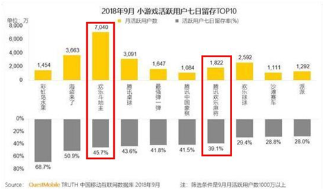 而在9月份(fèn)小(xiǎo)游戏活跃(yuè)用户(hù)七日留(liú)存TOP10榜单上,腾讯旗下《欢乐(lè)斗地主》和(hé)《腾讯欢乐麻将》的七日留存率也相对较高(gāo)。即使(shǐ)是和如今大热的休闲游戏《海盗来了(le)》相比,《欢乐斗(dòu)地主》虽然留存率略低,但(dàn)是活跃用户(hù)数则远高于《海盗来了》。此外,根据另一第(dì)三方统计机构艾瑞咨询提供的数据显示,《欢乐斗地主》APP版的七日留存率和(hé)其小游戏版本(běn)相比,也低(dī)了至(zhì)少十(shí)个(gè)百分点。