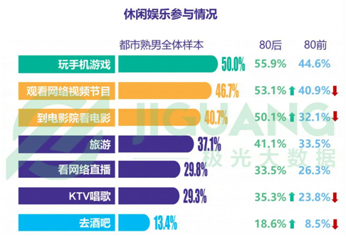 从休(xiū)闲娱乐的参与(yǔ)情况来看,和其他(tā)休闲(xián)方式相比,手游以50.0%的(de)占比(bǐ)成(chéng)为(wéi)都市成熟男性的首(shǒu)要(yào)选择。而从不同的年龄分(fèn)层来看,80后的参(cān)与(yǔ)度显然更(gèng)高,比80前(qián)男性高(gāo)出了11.3个百分点。