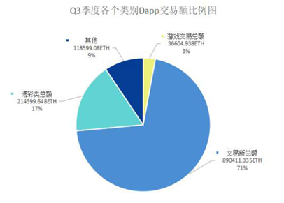 根据以太坊公布的(de)数据显示,在第三(sān)季度期间,从平台上(shàng)的交易额来(lái)看,博彩(cǎi)类的总交(jiāo)易额高(gāo)于游戏类近6倍,成为Q3交易额的主(zhǔ)要(yào)贡(gòng)献者。而整(zhěng)个(gè)第三季度(dù),以太坊内游戏类DApp共有(yǒu)312个,其中仅博彩类DApp就(jiù)占了111个。表现最好(hǎo)的Fomo3D,它的交易(yì)额占(zhàn)博彩类DApp交易总(zǒng)额的(de)56%。