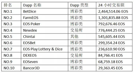 据比特(tè)大师了(le)解(jiě),在EOS的108个DApp中,有(yǒu)51个(gè)是博彩(cǎi)类DApp,占总量的47.22%。而在成交(jiāo)量最(zuì)大的前十个中,有7个(gè)是博(bó)彩类,共计交易额5193114.17EOS。其中(zhōng),交易额最高的(de)是BetDice,24小时的交易额为2464514.06EOS。