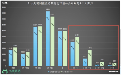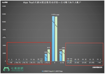 ②从Top3和Top10关键词总(zǒng)数上来看:如(rú)果大家(jiā)觉(jiào)得上图对比不太明显(xiǎn),可以看(kàn)下方Top3和Top10关键词覆盖总数变动详情图。减少(shǎo)区(qū)间(-1以下)中,个人账号下的App数(shù)量和公司账号下的(de)App数量对比,相差很悬殊。
