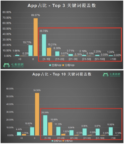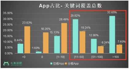 例(lì)如,在覆(fù)盖(gài)总量变化的几个区间(jiān)中,仅(jǐn)进入分类榜的App关键词覆(fù)盖数降低、不(bú)变、少(shǎo)量增加(1~10)的比(bǐ)例更多;而总榜App关键词覆盖总(zǒng)量(liàng)增加超(chāo)过10以上的App比例呈逐渐增多趋势。