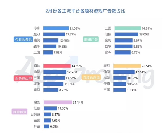 对(duì)2月份不同流(liú)量平台的各(gè)游戏题材(cái)投放的(de)广(guǎng)告数进一步分析,可得以下占比(bǐ)情况(kuàng)。各大流量(liàng)平台的广(guǎng)告素(sù)材中,棋牌类游戏占比较少。仅在百度信息流上,棋牌类的广告数(shù)占比达到了前三,其余流量(liàng)平台(tái),都没有棋(qí)牌的身影。欧陆平台分析(xī),主要有两个原因:一是各(gè)大流量(liàng)平台推广政(zhèng)策限(xiàn)制,为了(le)稳定跑量,现有在跑的(de)棋牌素材都是(shì)老素材。二是棋牌类推(tuī)广(guǎng)素材有诸多限(xiàn)制,过审较难,导致广告投放师(shī)不能尝试(shì)不同素(sù)材的效果。