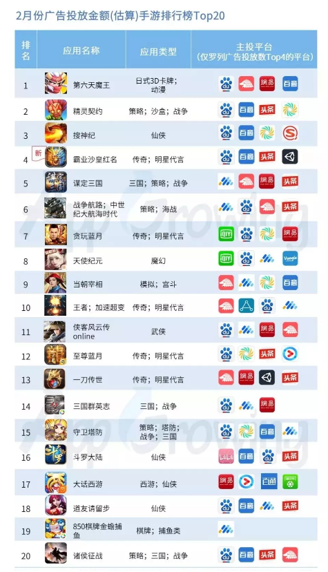 广(guǎng)告投放金额 (估算)Top20手游(yóu)中,棋牌类(lèi)的只有一款《850金蟾(chán)捕鱼》,而其主要投(tóu)放(fàng)平台为腾讯广点通。
