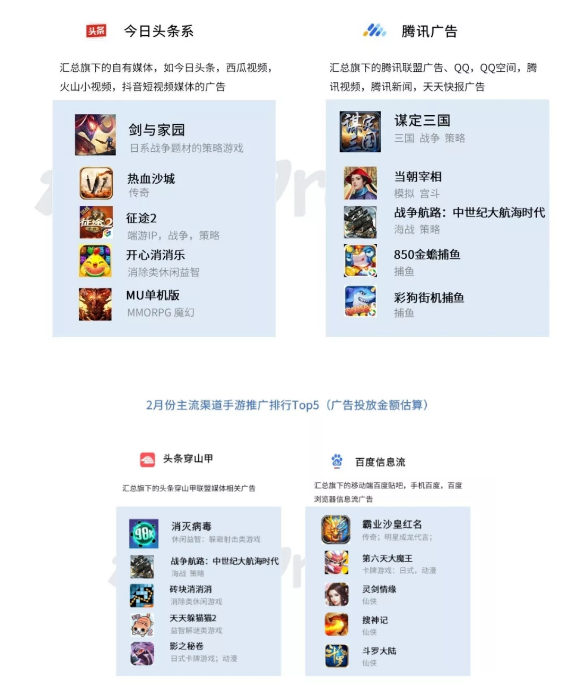 2)主(zhǔ)流广(guǎng)告渠道(dào)手游(yóu)排行榜Top5(广告(gào)投放金额估算)