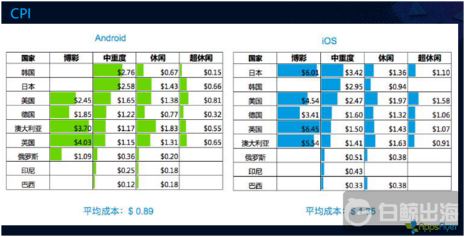 ioses和安卓端的各国(guó)游戏获客(kè)成本 | 来(lái)源:AppsFlyer
