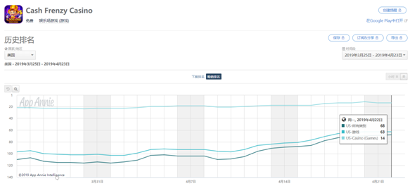 在 4 月 12 日(rì),北京博乐科技有限公司(sī)(“博乐游戏”)在 2019 年 1 月推出的一(yī)款新手游《CashFrenzy Casino》进入了(le) Google Play 美国畅销总榜 Top 100,并在此(cǐ)后(hòu)一直保持上升(shēng)趋势,4 月(yuè) 22 日(rì),稳定在 Google Play 美(měi)国畅销总榜第 68 名的位置。