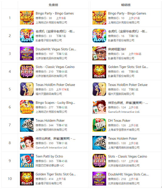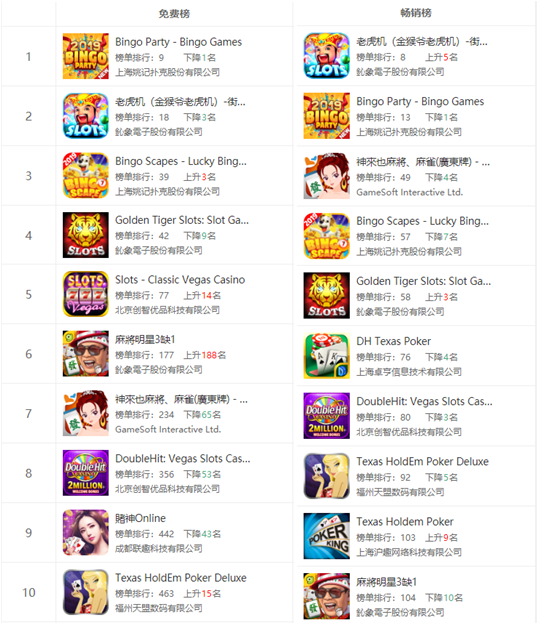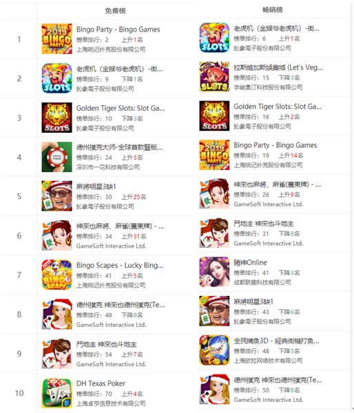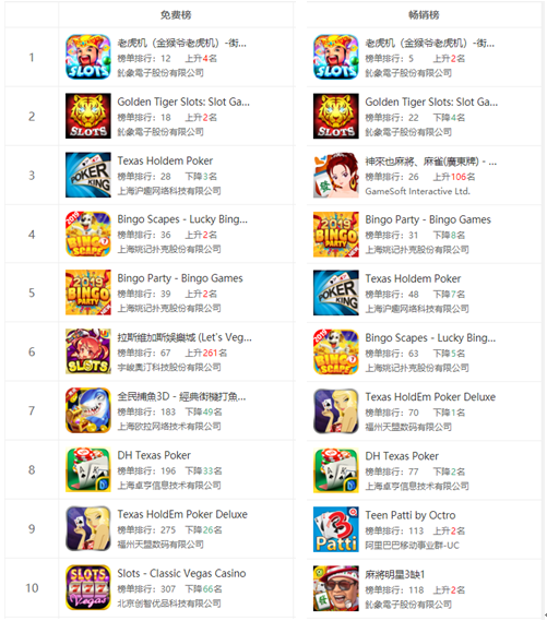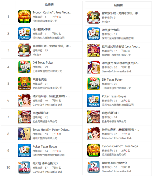 Google Play赌场游戏免费榜中,国内厂商占据6席,台(tái)湾厂商占据4席,而(ér)畅销榜则是五五开的局面。