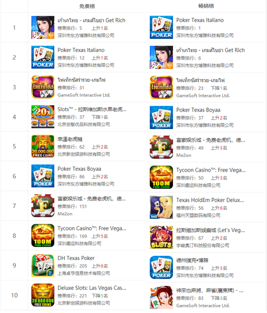 泰国Google Play赌(dǔ)场游戏(xì)免费榜和畅销榜排名