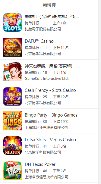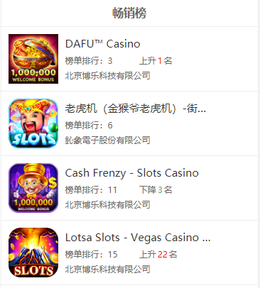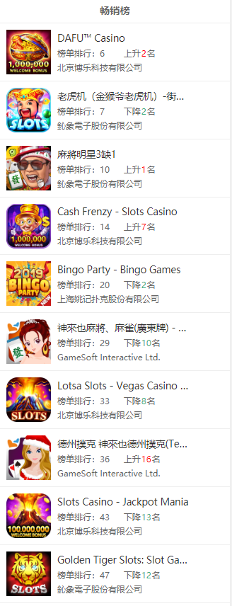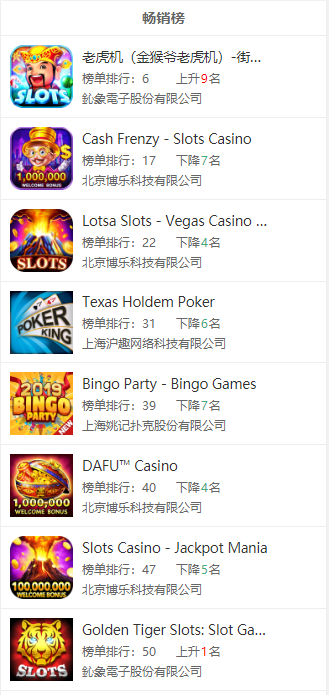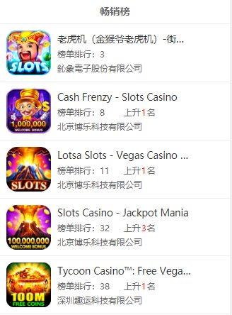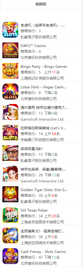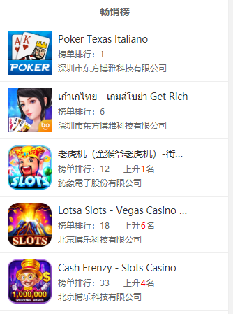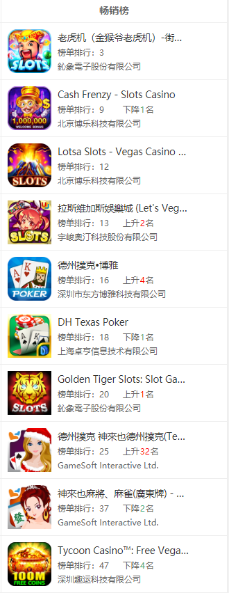 虽然(rán)说国内很多棋牌从(cóng)业者将菲律宾当作其海外(wài)业(yè)务开(kāi)展的首(shǒu)选,但说(shuō)实话国内厂(chǎng)商在菲律宾(bīn)当地的棋牌市(shì)场占比不算高。GooglePlay畅销榜TOP50中,有5款游戏3家公司入榜,其中博乐(lè)科技砍(kǎn)下三席(xí),占据半壁江山(shān)。AppStore畅销榜TOP50中,则(zé)共有4款游戏(xì)2家公司入(rù)榜,博乐科(kē)技再下三席。值得注意的是(shì),拿下菲律宾(bīn)畅(chàng)销榜TOP50的游戏,都是(shì)老虎机游戏。重点关注:北(běi)京博乐(lè)科技有限公司(sī)、鈊象电子股(gǔ)份有限(xiàn)公司(台湾)。