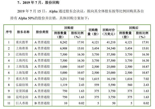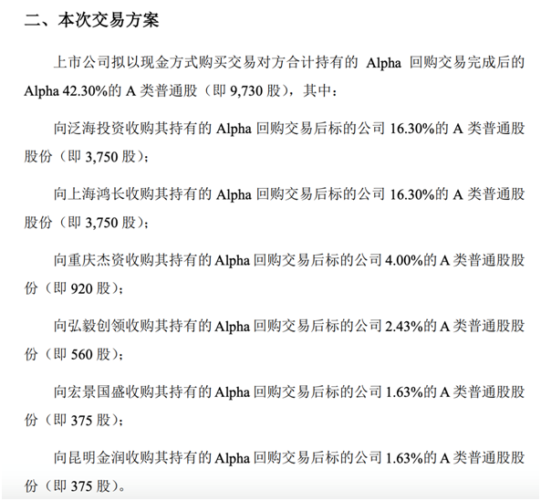 Alpha将向全体股东(dōng)等比回购50%股权,回购完成(chéng)后,巨(jù)人网络将(jiāng)收购Alpha42.3%的股权。