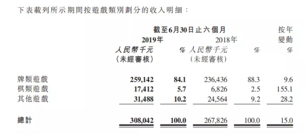根(gēn)据财报显(xiǎn)示,收入主要来源于游戏(xì)内置广告(gào),从(cóng)2018年5月起,禅游科技(jì)根据(jù)政策调整收入策略,鼓励更(gèng)多玩家通过观(guān)看视频或点击(jī)广告链(liàn)接(jiē)等(děng)游戏(xì)内广告(gào)获取游戏内虚拟物品。 在策略调(diào)整期间(jiān),该公(gōng)司广告收(shōu)入(rù)比重逐渐增加(jiā),截(jié)至2019年6月30日6个月广告业务收入约为1.01亿元,较2018年同(tóng)期收入210万人民(mín)币(bì)增加约48倍,而销售虚拟物品所得收入约为人民币2.07亿元,较2018年同(tóng)期的(de)2.66亿元减少22.3%,公司总收入(rù)为(wéi)3.08亿元,较去年(nián)同(tóng)期2.68亿元增加约(yuē)15%。其中(zhōng),棋牌类游戏收(shōu)入占总收入比(bǐ)重较重(chóng),达到2.76亿(yì)元。