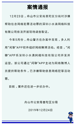 12月(yuè)24日(rì)晚(wǎn),浙江普陀公(gōng)安(ān)在(zài)官方微信公众号发布案情通报(bào),12月23日,舟山市公安局(jú)普陀(tuó)区分局对涉嫌(xián)帮助(zhù)信息网络犯罪活动罪的深圳小水(shuǐ)滴网(wǎng)络科技有(yǒu)限公(gōng)司依法(fǎ)开展现场调查取证。