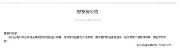 2018年8月底,《欢乐(lè)麻将》《欢乐(lè)斗地(dì)主》先(xiān)后发布公告,宣布部分(fèn)功(gōng)能(néng)调整(zhěng),好友房功(gōng)能暂时无法使用。