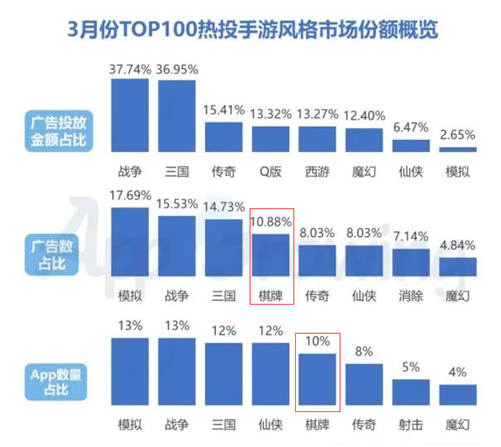 据App Growing数据显示,3月手(shǒu)游买量市场共(gòng)监(jiān)测到近5000款手游投放广告,相比2月份投(tóu)放的数量(liàng)有所增加(jiā)。其中棋牌游戏厂商买量在3月有较大幅度的增长,参与买量(liàng)的棋牌APP占比达10%,广告数占比达10.88%。