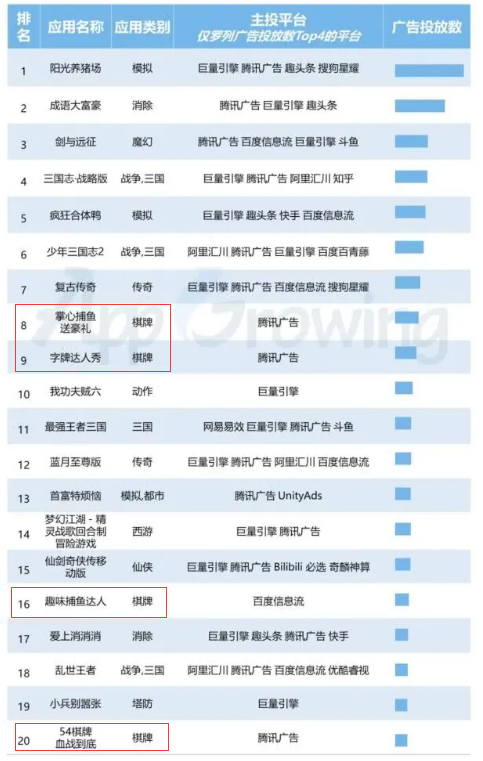 具体到3月投放的广告数量(liàng)上,手游TOP20中(zhōng),共有4款棋牌游戏,分别为:《掌心捕鱼送豪(háo)礼》、《字牌达人秀》、《趣味捕鱼达人》、《S4棋牌血(xuè)战到底》。