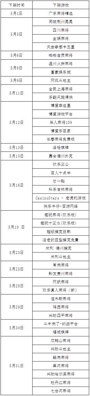 据七(qī)麦数据(jù)提供的资料显(xiǎn)示,2020年5月App Store中(zhōng)国区(qū)上架棋牌游戏共6款(不包括(kuò)英(yīng)文游戏名称(chēng)及重新上架的棋牌游戏),下架棋牌游戏46款(kuǎn),其中兴动游戏(xì)旗下(xià)地方麻将下架10余款。