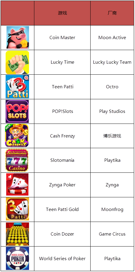 其中有两款(kuǎn)国内开发商的产品(pǐn)分别进入榜单第三和第五。它们(men)是:阿里UC旗下的《Teen Patti》和博乐游(yóu)戏(xì)旗(qí)下的《Cash Frenzy》。以下是具体榜单: