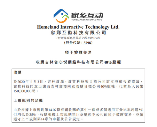 11 月 3日丨家(jiā)乡互动宣布,于2020年11月3日(rì),公司(sī)附属吉林鑫泽拟(nǐ)向鑫(xīn)宝科技收(shōu)购目标公司吉林(lín)省心(xīn)悦网络科技有限公司40%股权(quán),代价(jià)为人民币1.50亿元。