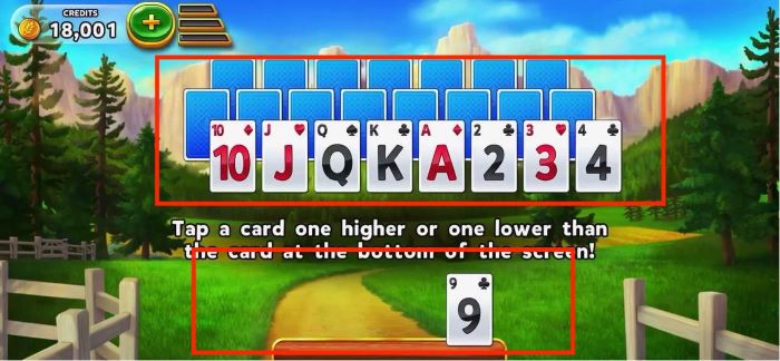 在游戏中玩家需要做的就是根据牌库中(zhōng)翻(fān)开(kāi)的第一张牌(pái)的数字(zì),将牌堆(duī)中该数字对应(yīng)的左(zuǒ)右两边的牌放入牌库中,依(yī)此类(lèi)推。玩家(jiā)每(měi)次将牌(pái)移回后,牌库中(zhōng)翻开的牌就将(jiāng)变为移回的那(nà)张牌的数字。如(rú)果在牌(pái)堆中的牌无法满足移回的条(tiáo)件(jiàn),那么玩家可以(yǐ)点(diǎn)击(jī)牌库更改翻开的卡牌,当玩(wán)家将(jiāng)牌堆中的牌全部移回到牌库后,就算成功通关。