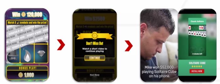 在游戏中,玩家(jiā)可通过刮(guā)奖(jiǎng)券赢得筹码,再用筹码兑(duì)换真金或礼品卡。但每天的(de)刮(guā)奖次数有(yǒu)限(xiàn),一(yī)旦玩家在一段时间内达到(dào)上(shàng)限(xiàn),游戏就会(huì)提示玩家通过(guò)观看激励视频来获得(dé)刮奖次数(shù),这也正好达到了向玩家推送广告以此形(xíng)式盈利的目的。