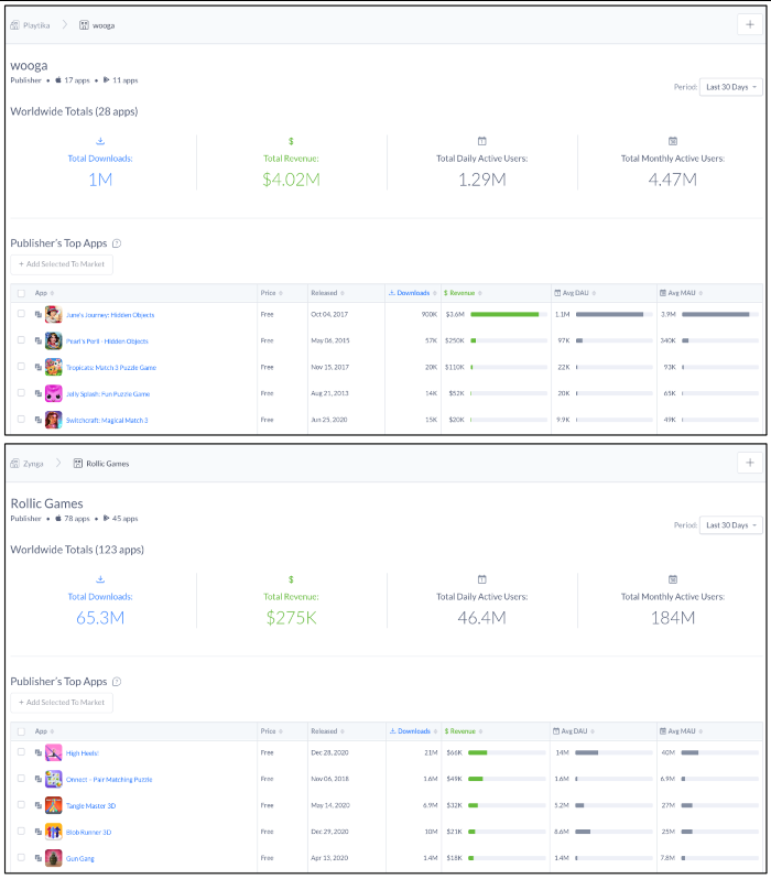 以Playtika、Zynga为(wéi)例,这两家头部厂商采用了(le)多(duō)元化竞争策略,通(tōng)过收购其他类(lèi)型(xíng)的手游公司,扩展业务范(fàn)围,寻(xún)找更多的增(zēng)长动力。根(gēn)据Apptopia中(zhōng)两家厂商(shāng)的发行图谱来看,Playtika旗下的wooga和Zynga旗下的(de)Rollic