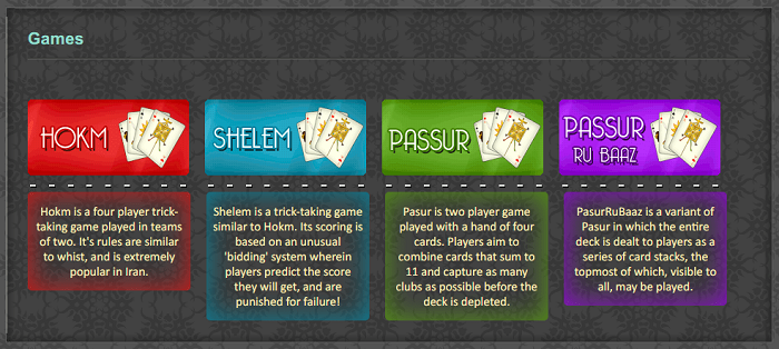 伊(yī)朗的纸牌游戏玩(wán)法有很多种,除了上(shàng)文展示(shì)的Hokm和Passur以及(jí)变种之外,还有(yǒu)Pishe Pasha(皮什帕沙(shā)),Pishe Pasha是(shì)一(yī)个犹太的纸牌游戏,但是又有(yǒu)一定(dìng)的伊朗血统,在伊朗的犹太社区比较受欢迎;Rim,Rim是Rummy的一个变(biàn)种,当(dāng)某玩(wán)家达到目标分数(300 或(huò) 500)时,获(huò)胜者是得分最少的玩(wán)家(jiā)……