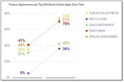 Battle Pass 可以增加单(dān)局游戏之间的进度感,还可以为(wéi)玩家带来成就(jiù)感。这种功(gōng)能在社交(jiāo)棋 牌游戏里的普及率没有那么高,占(zhàn)据(jù)了 36%,但在(zài)这两年来(lái)出现了大幅增(zēng)长。