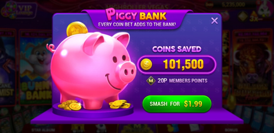 存钱罐(guàn)系统是一个有效(xiào)的变(biàn)现和参与度提升工(gōng)具,用户们(men)通过玩游戏的方式不断增加(jiā)储蓄,一旦存满,你可以用(yòng)非常低的价(jià)格买到其中的内容。在(zài)社交(jiāo)棋牌品类,该(gāi)功(gōng)能的设计 模式没有太(tài)大(dà)的差别,但简单(dān)就是优势(shì)。
