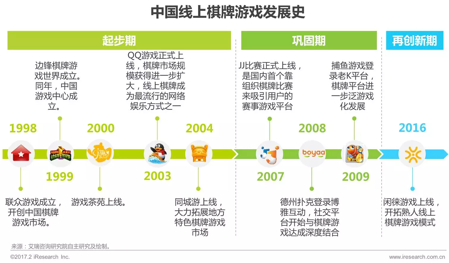 1998年联众游戏上线,中国(guó)线上棋(qí)牌游戏市场正式启动(dòng)。在(zài)这18年间不同的棋牌游戏平台不断推陈(chén)出新,各种别具(jù)特色的运营模式也不断地为市场带来了活力。2016年在(zài)闲徕等新兴平台的推动下,棋(qí)牌游(yóu)戏行业有(yǒu)望迎来(lái)再创新(xīn)与再突破。