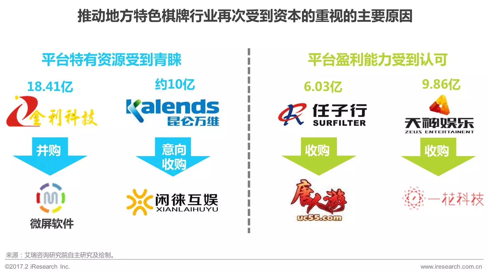 之前(qián)已经提到国内资本市场在过去的几年中已经发(fā)起了(le)多起针对棋牌(pái)公司的大规模收购。据艾瑞咨询统计,其中至少有(yǒu)4例收购(gòu)意(yì)向是(shì)针对地方(fāng)特(tè)色棋牌游戏平台的。由(yóu)此可见,地方特色棋牌行业(yè)在经历了多年的(de)沉(chén)寂之(zhī)后(hòu)再迎资本(běn)投资热潮。