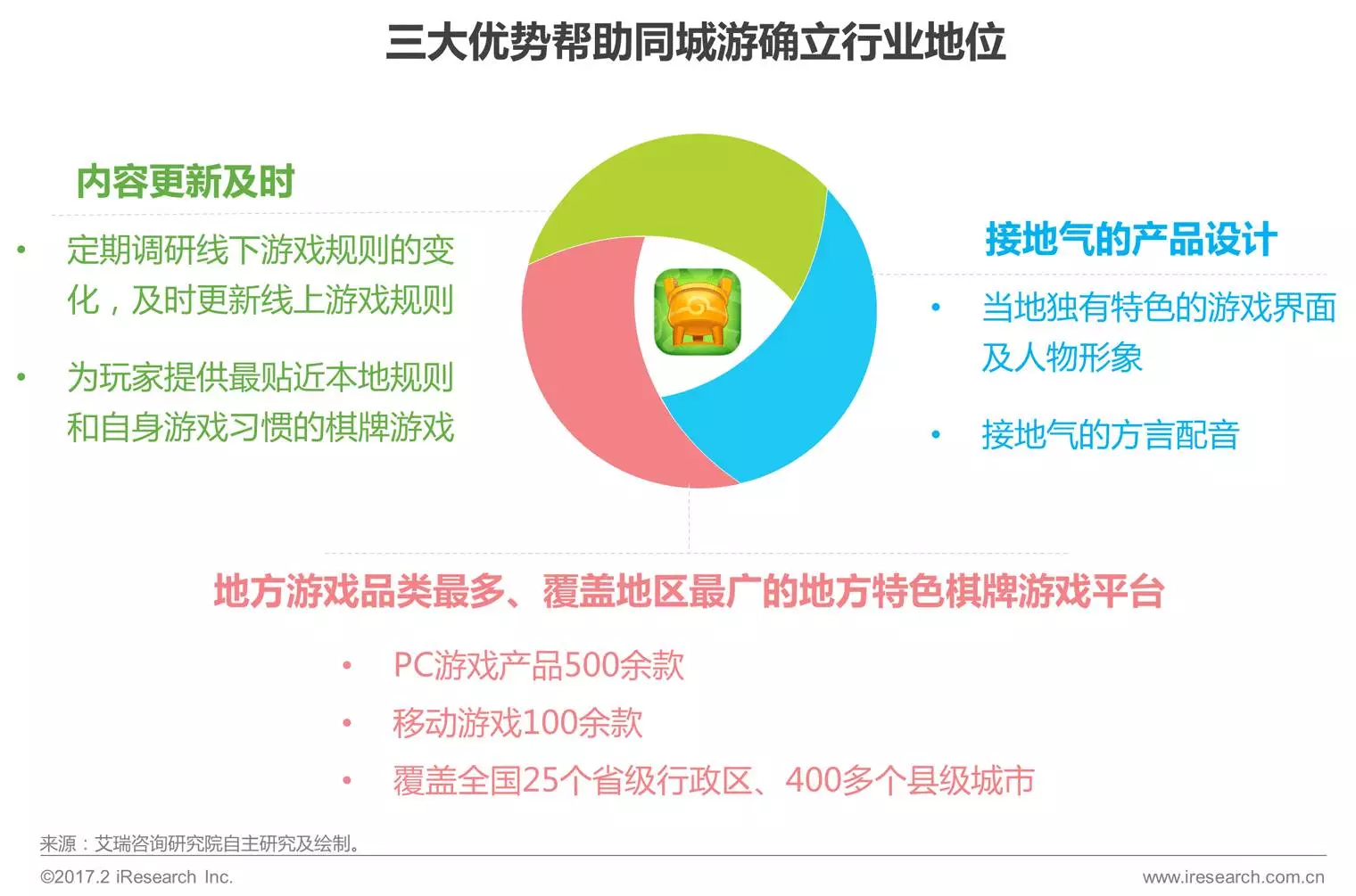 通(tōng)过十(shí)余年的经验积累,同(tóng)城游的产品策略早已成(chéng)熟。其中(zhōng)多而(ér)广的棋牌品类开发及接(jiē)地气(qì)的产品、规则设定是帮助同城游多年来持(chí)续吸引地方特色(sè)棋牌用(yòng)户的主要特点(diǎn)所在。